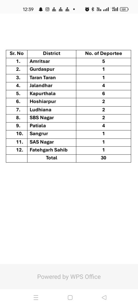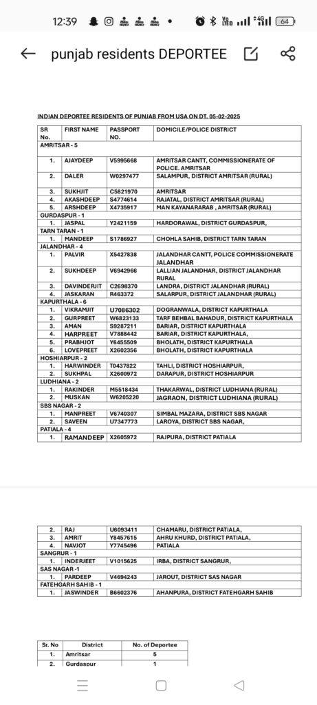 अमेरिका स्थित भारतीय दूतावास द्वारा निर्वासित किए जाने वाले भारतीयों की सूची के अनुसार, सूची में पंजाब, चंडीगढ़, हरियाणा, गुजरात, महाराष्ट्र और उत्तर प्रदेश के 104 भारतीय नागरिक हैं। निर्वासित किये जा रहे भारतीयों में 18 वर्ष से कम आयु के 12 बच्चे और लगभग 24 महिलाएं शामिल हैं। जिए पंजाब के 30 युवक शामिल है और जालंधर के 4।