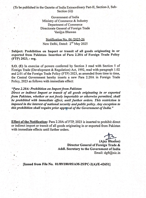 पहलगाम आतंकी हमले के बाद भारत की ‘मोदी सरकार’ एक्शन में है। सरकार पाकिस्तान के खिलाफ कड़े फैसले ले रही है। मोदी सरकार ने शनिवार (3 मई) को पाकिस्तान को तगड़ा झटका दिया। सरकार ने देश की सुरक्षा और जनता में बड़ा कदम उठाया है। भारत वाणिज्य मंत्रालय ने पाकिस्तान से आने वाले सभी सामानों के आयात (इंपोर्ट) पर रोक लगा दी है। अब पाकिस्तान से सीधे या किसी और रास्ते से कोई भी चीज भारत में नहीं लाई जा सकेगी। यह नियम तुरंत लागू हो गया है। सरकार ने नोटिफिकेशन जारी कर कहा-अगर किसी को इस रोक से छूट चाहिए, तो उसे भारत सरकार से इजाजत लेनी होगी।