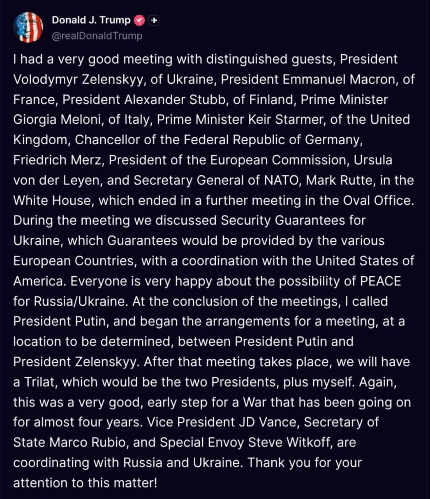 जेलेंस्की ने बताया कि ट्रम्प और यूरोपीय नेताओं के साथ हुई बैठक में यूक्रेन की सुरक्षा के लिए एक योजना पर बात हुई। इसके तहत यूक्रेन यूरोप के पैसे से 90 अरब डॉलर के अमेरिकी हथियार खरीदेगा। जेलेंस्की ने कहा कि सुरक्षा का एक और हिस्सा यह होगा कि यूक्रेन ड्रोन बनाएगा, जिनमें से कुछ को अमेरिका खरीदेगा। प्रेस कॉन्फ्रेंस में जेलेंस्की ने कहा कि यह योजना अभी चर्चा में है और कोई अंतिम समझौता नहीं हुआ है। उन्होंने बताया कि अगले एक हफ्ते या 10 दिनों में इस समझौते को अंतिम रूप दे दिया जाएगा।
