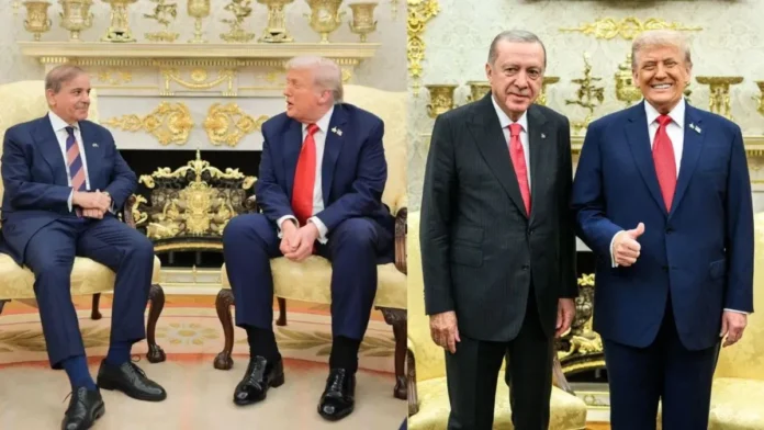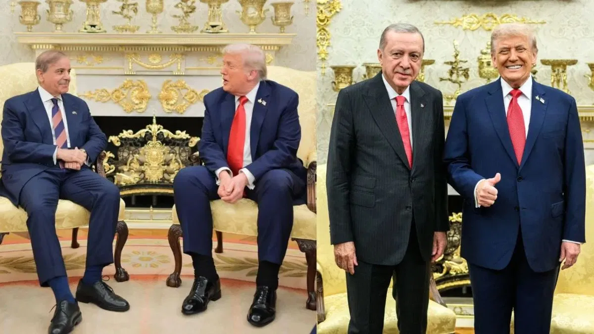 UNGA की बैठक के लिए दुनिया भर के नेता अमेरिका पहुंचे हैं। ऐसे में कई नेताओं से अमेरिकी राष्ट्रपति डोनाल्ड ट्रंप ओवल ऑफिस में मुलाकात कर रहे हैं। डोनाल्ड ट्रंप पिछले 24 घंटे में भारत के दो दुश्मन देशों पाकिस्तान और तुर्किए के साथ मुलाकात कर चुके हैं। गुरुवार को ट्रंप ने ओवल ऑफिस में तुर्की के राष्ट्रपति रेसेप तैयब एर्दोआन और पाकिस्तान के प्रधानमंत्री शहबाज शरीफ और फील्ड मार्शल आसिम मुनीर से मुलाकात की।