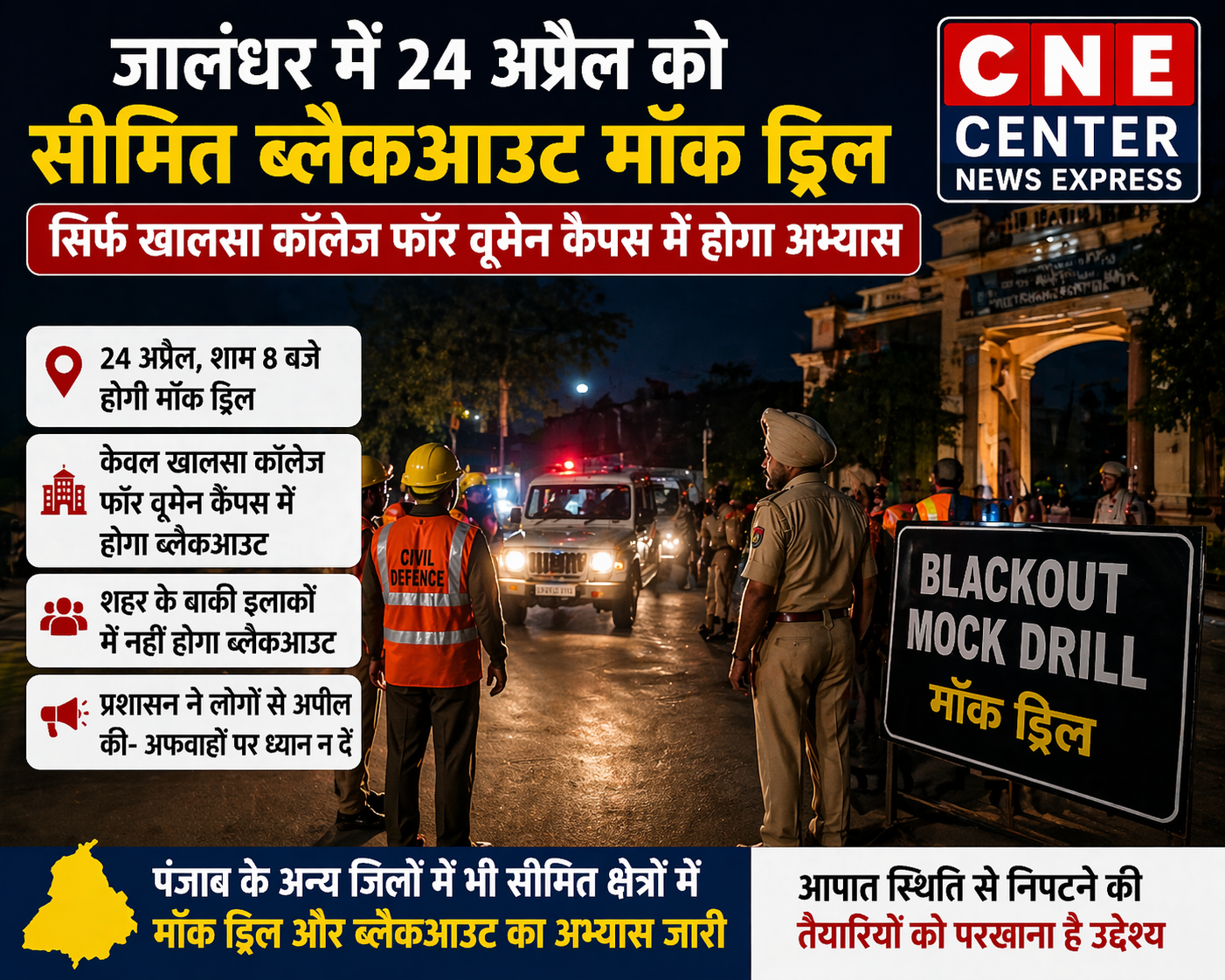 जालंधर के डिप्टी कमिश्नर वरजीत वालिया ने बताया कि 24 अप्रैल शाम 8 बजे ब्लैकआउट मॉक ड्रिल केवल खालसा कॉलेज फॉर वूमेन कैंपस में ही की जाएगी। शहर के बाकी हिस्सों में कोई ब्लैकआउट नहीं होगा।